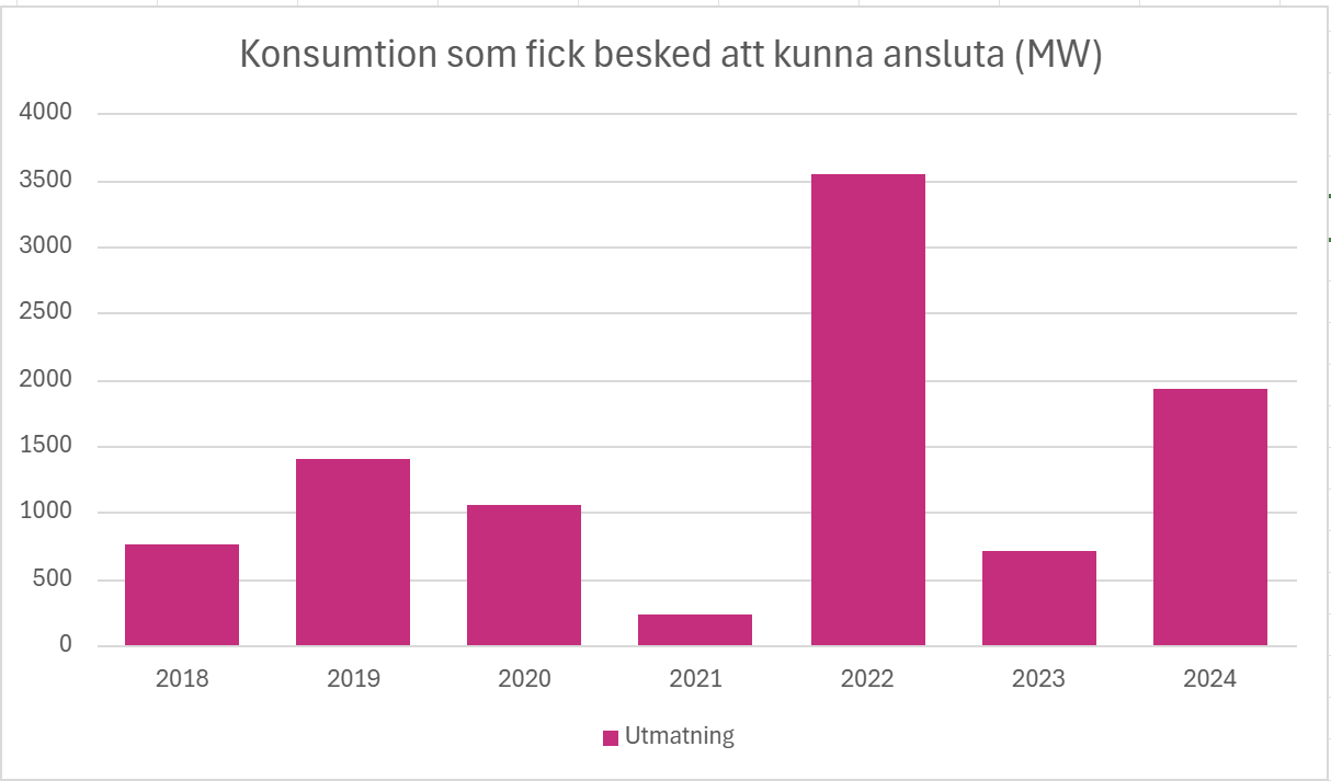 I Svenska kraftnäts prognos ökar elanvändningen i Sverige från 149 TWh år 2024 till 180 TWh år 2028. I hela Norden från cirka 400 TWh till cirka 500 TWh. Ny elanvändning ansluts till Sveriges elsystem kontinuerligt. Se bilden nedan om konsumtion (MW) som fått förhandsbesked att kunna ansluta, både till lokalnäten och regionnäten.
