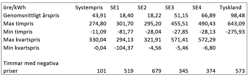 Det högsta timpriset för året uppgick till 490 öre/kWh i Malmö den 20 januari klockan 08:00–09:00 och det lägsta timpriset uppgick till -82 öre/kWh i Luleå den 2 oktober klockan 19:00 –20:00. Det högsta kvartspriset uppgick till 572 öre/kWh och inträffade i Malmö den 14 oktober klockan 18:45-19:00, medan det lägsta uppgick till -104 öre/kWh och inträffade den 2 oktober klockan 18:45-19:00.