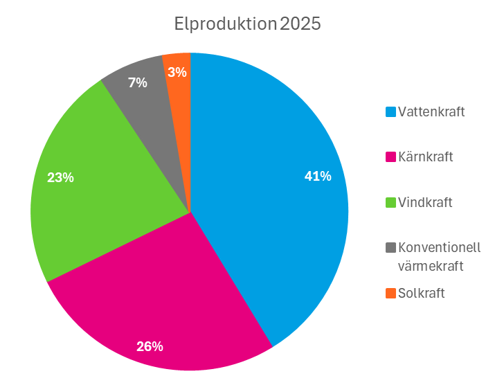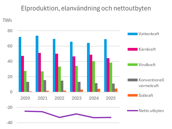 PRESSMEDDELANDE 25-12-30. Elpriserna 2025 präglades av ökade svängningar och en splittrad prisbild mellan norr och söder där instängd vatten- och vindkraft gav rekordlåga priser i norra Sverige under sommaren. Den totala elproduktionen var fortsatt hög, liksom landets nettoexport och importen av el var rekordlåg. Elproduktion från vattenkraft och solkraft ökade medan övriga kraftslag producerade mindre än föregående år.